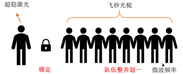 如果把超穩光生微波源比作排隊走的隊列,那么超穩激光就像隊列里面的帶隊人,隊伍的步伐大小、整齊度、每位隊員的相對位置都由這個領隊決定。飛秒光梳就像隊列里面的隊員,在沒有和超穩激光建立聯系之前,光梳是自由運轉的,就如圖 6中所示的一樣混亂。而當通過一系列復雜的操作和領隊建立聯系后,就能使得每位隊員的步伐大小、步速、以及和其他隊員的相對位置都和領隊高度同步,如同圖 7所示,這樣就產生的超穩光生微波信號。