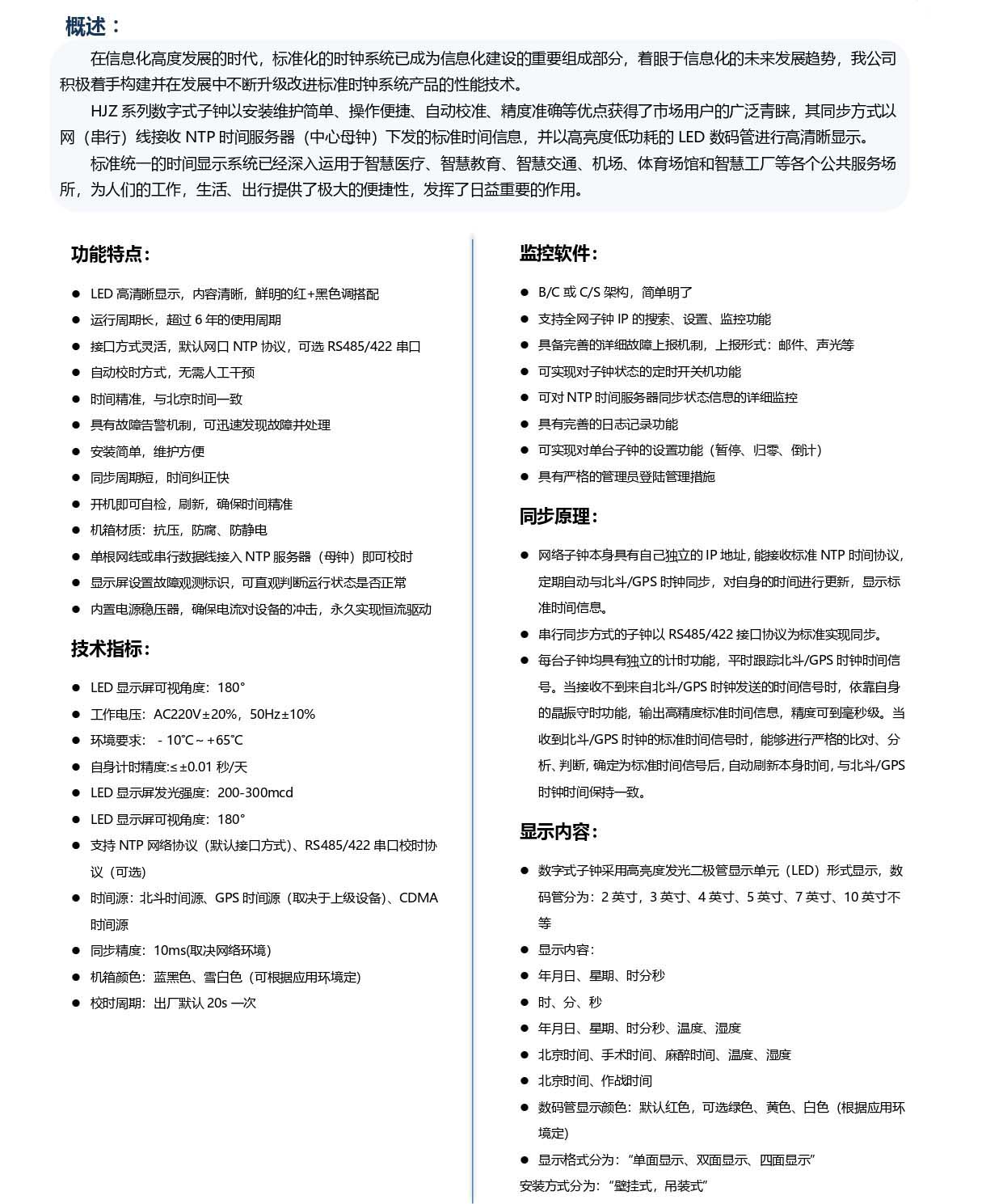 標準化的時鐘系統已成為信息化建設的重要組成部分,著眼于信息化的未來發展趨勢,我公司積極著手構建并在發展中不斷升級改進標準時鐘系統產品的性能技術。HJZ系列數字式子鐘以安裝維護簡單、...